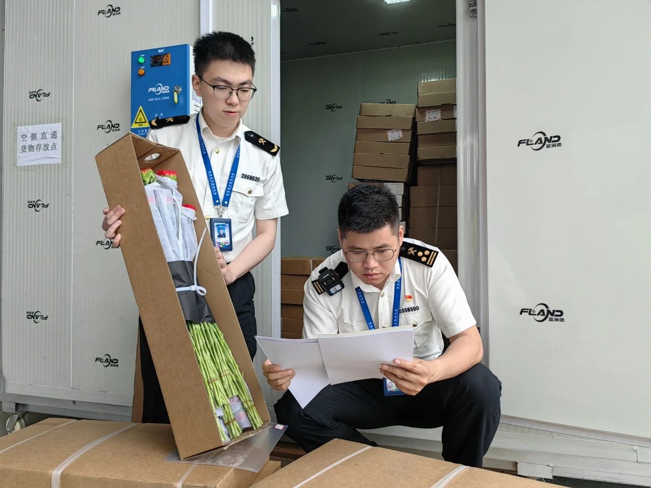 圖為:鹽城海關(guān)關(guān)員對“空側(cè)直通”貨物進行監(jiān)管。王義/攝