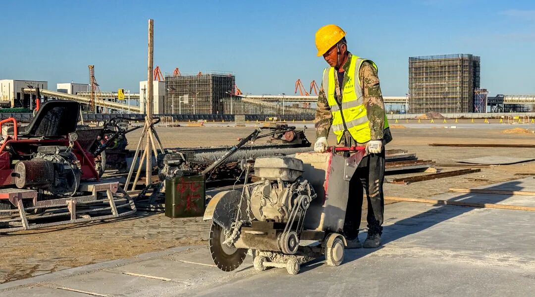 工人們正進行混凝土面層收尾作業