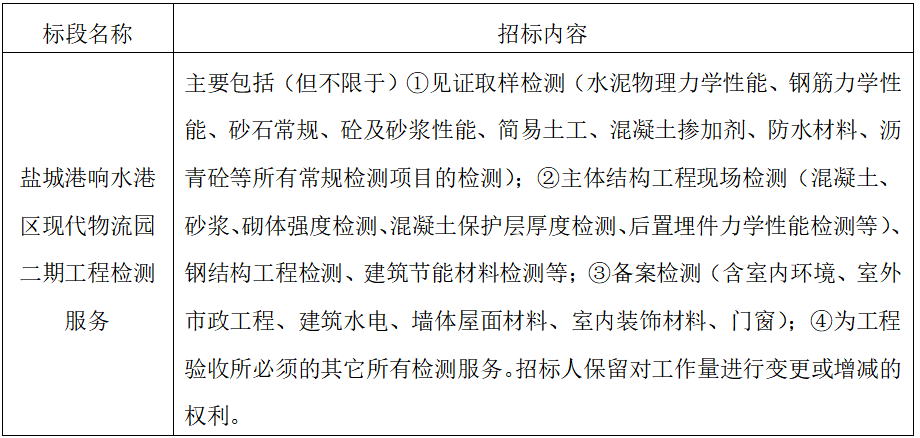 8、項(xiàng)目標(biāo)段劃分:鹽城港響水港區(qū)現(xiàn)代物流園二期工程檢測服務(wù)共為1個(gè)標(biāo)段,標(biāo)段信息如下:
