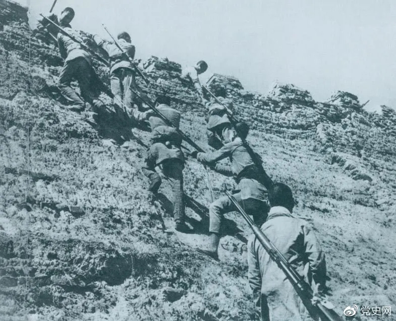1945年6月25日,八路軍冀中部隊(duì)攻克河北獻(xiàn)縣。圖為部隊(duì)奮勇攀登城墻。