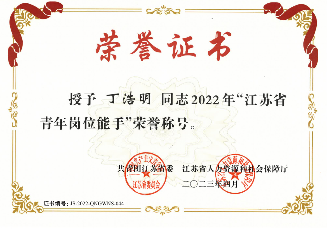 近日,共青團江蘇省委發布《關于公布2022年江蘇省(杰出)青年崗位能手認定結果的通知》,我集團丁浩明同志榮獲“江蘇省青年崗位能手”榮譽稱號。