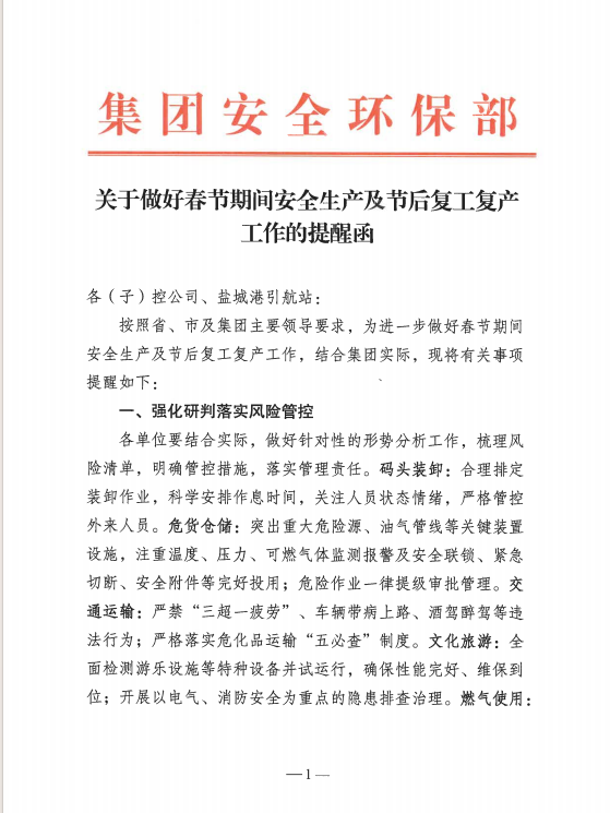 2024年是全面完成“十四五”規(guī)劃目標(biāo)任務(wù)的關(guān)鍵之年,是集團(tuán)打造“五新示范港”的突破之年,也是安全生產(chǎn)治本攻堅(jiān)三年行動(dòng)的開局之年。集團(tuán)黨委高度重視安全生產(chǎn)、環(huán)境保護(hù)、平安建設(shè)工作,從行動(dòng)上落實(shí)省、市決策部署,從源頭上消除事故隱患,全力以赴落實(shí)落細(xì)安全生產(chǎn)、環(huán)境保護(hù)、平安建設(shè)各項(xiàng)工作,持續(xù)夯實(shí)高質(zhì)量發(fā)展根基。