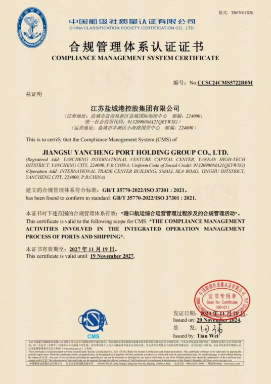 11月22日,鹽城港集團(tuán)順利通過中國船級社質(zhì)量認(rèn)證有限公司(CCSC)的合規(guī)管理體系審核認(rèn)證,獲得合規(guī)管理體系認(rèn)證證書,成為江蘇省首家獲得合規(guī)管理體系證書的港航企業(yè)。