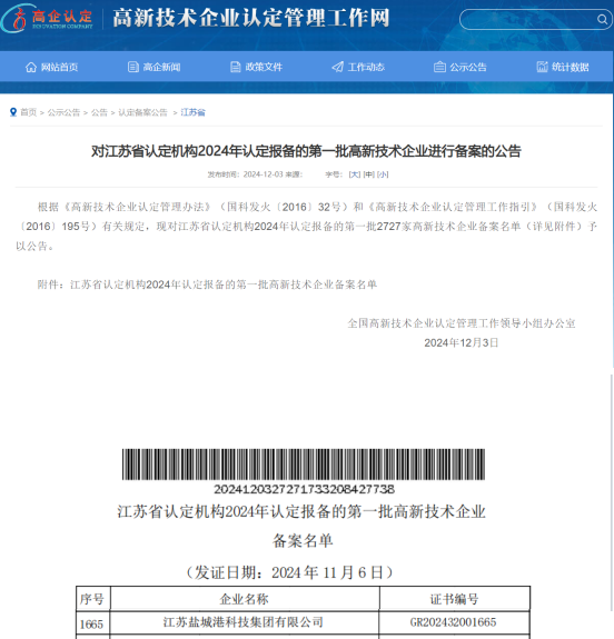 12月3日,鹽城港科技集團(tuán)成功通過“高新技術(shù)企業(yè)”認(rèn)定,提前一年完成國家高新技術(shù)企業(yè)認(rèn)定的既定目標(biāo),標(biāo)志著鹽城港集團(tuán)科技創(chuàng)新工作實現(xiàn)重大突破,邁入轉(zhuǎn)型升級新階段。