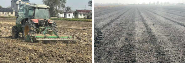 為預防連續陰雨天氣給秋播耕整帶來的“爛耕”“爛種”風險,水稻收割一結束,技術人員便迅速深入田間,逐塊排查墑情。對于土壤濕度大、易積水的地塊,立即開挖排水溝,加速積水排出,降低土壤含水量,為耕整作業掃清障礙。在耕整過程中,公司嚴格執行秸稈還田率達到100%標準,將農業廢棄物變廢為寶,既改善土壤結構,又增加有機質含量;旋耕整地嚴格把控質量,土壤深翻深度控制在25—30厘米,確保耕作層疏松透氣,有利于小麥根系下扎;農機操作要求“耕翻到頭、到邊,無漏耕、無死角”,確保地塊耕整質量均勻一致,為高質量播種打造“優質土壤環境”。