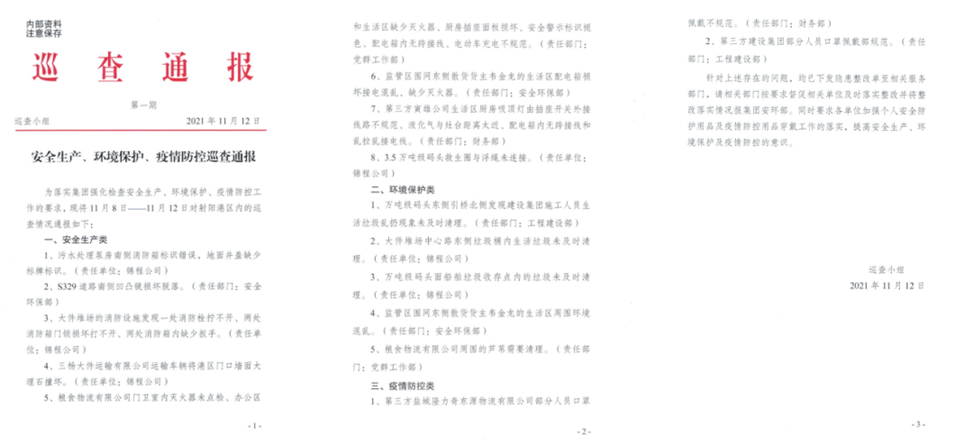 安全巡查員每日對(duì)港區(qū)內(nèi)安全生產(chǎn)、環(huán)境保護(hù)、疫情防控工作進(jìn)行檢查,對(duì)進(jìn)港人員信息登記、作業(yè)人員勞動(dòng)防護(hù)用品穿戴、作業(yè)現(xiàn)場(chǎng)安全管理等情況逐一細(xì)致排查,確保不放過一個(gè)死角,不留下一個(gè)隱患。對(duì)巡查中發(fā)現(xiàn)的問題隱患,及時(shí)下發(fā)整改通知單,要求相關(guān)責(zé)任單位、部門限期整改,并對(duì)照整改時(shí)限進(jìn)行復(fù)查,確保隱患整改到位。