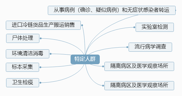 6.“特定人群”:在新冠肺炎疫情期間,從事病例(確診、疑似病例)和無癥狀感染者轉(zhuǎn)運(yùn)、尸體處理、環(huán)境清潔消毒、標(biāo)本采集、實驗室檢測、流行病學(xué)調(diào)查、隔離病區(qū)及醫(yī)學(xué)觀察場所、衛(wèi)生檢疫、進(jìn)口冷鏈貨品生產(chǎn)搬運(yùn)銷售等工作的人群。