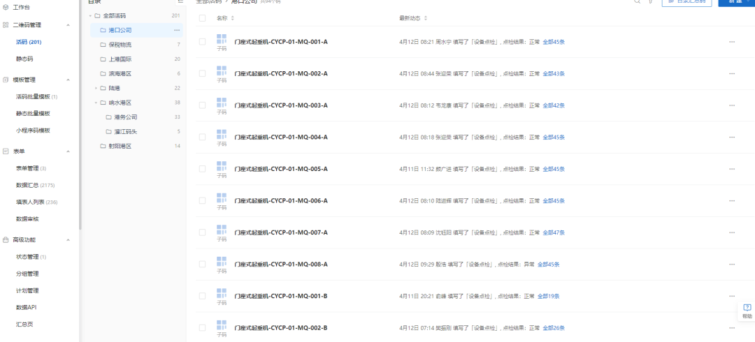 現(xiàn)場(chǎng)維護(hù)保養(yǎng)人員通過(guò)掃描港口設(shè)備上的二維碼,即可將設(shè)備維修、點(diǎn)檢和保養(yǎng)記錄錄入設(shè)備二維碼中,后臺(tái)數(shù)據(jù)實(shí)時(shí)更新,管理人員可隨時(shí)隨地查看全集團(tuán)港口設(shè)備的運(yùn)行情況,實(shí)現(xiàn)集團(tuán)集中掌握全部港口設(shè)備的運(yùn)行狀態(tài),提升了設(shè)備管理效率,對(duì)出現(xiàn)的問(wèn)題能夠及時(shí)解決。同時(shí),利用大數(shù)據(jù)匯總分析設(shè)備的整體狀態(tài),可以對(duì)設(shè)備后期的采購(gòu)、維護(hù)保養(yǎng)提供一定建議。