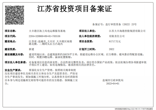 鹽城港大豐港區(qū)海上風(fēng)電運(yùn)維服務(wù)基地項(xiàng)目為市城鄉(xiāng)建設(shè)重點(diǎn)房建項(xiàng)目之一,位于大豐港區(qū)南港路北側(cè)、物聯(lián)大廈東側(cè),二期碼頭后方凸堤內(nèi),建設(shè)用地51畝,建筑面積約39370㎡,項(xiàng)目總投資81717萬(wàn)元,擬建設(shè)運(yùn)維辦公區(qū)、維修車間、安全培訓(xùn)中心等,后期部分建設(shè)避風(fēng)靠泊等配套設(shè)施;同時(shí)購(gòu)置29艘運(yùn)維、溢油處置船舶,通過(guò)建立運(yùn)維基地,統(tǒng)一運(yùn)維,打造專業(yè)運(yùn)維隊(duì)伍,共享運(yùn)維配套資源及數(shù)據(jù),降低鹽城地區(qū)各個(gè)海上風(fēng)電的運(yùn)維成本,促進(jìn)海上風(fēng)電高效運(yùn)行,帶動(dòng)風(fēng)電產(chǎn)業(yè)鏈的發(fā)展。