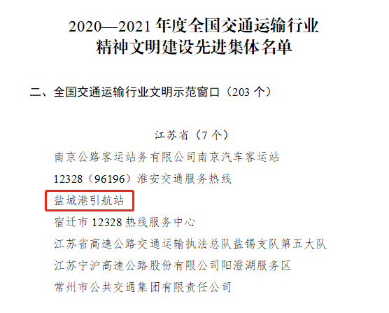 近日,交通運輸部印發《關于命名2020—2021年度全國交通運輸行業精神文明建設先進集體的決定》,鹽城港引航站作為2018—2019年度“全國交通運輸行業文明示范窗口”經過復核確認,繼續保留稱號,且是我市唯一獲得該項榮譽的單位。