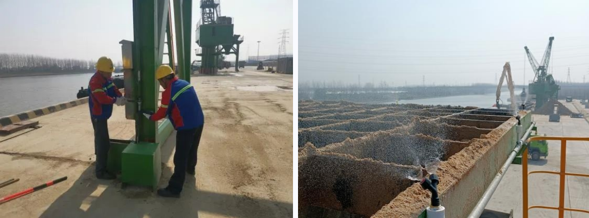 港機公司通過在設備上加裝高性能微霧裝置和圓錐形高壓微霧噴頭,來感應固定吊抓斗移動,當抓斗靠近料斗時觸發距離傳感器,系統自動打開噴霧,從而減少物料裝卸過程中的揚塵,實現散貨作業抑塵自動化。