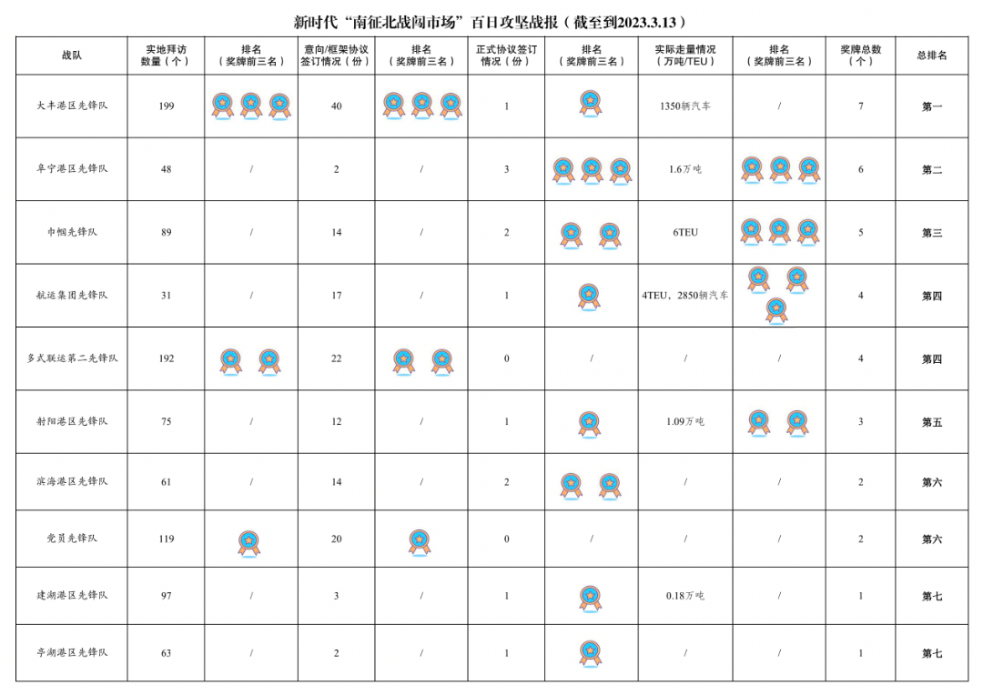 1.累計拜訪客戶數(shù)量1179家:其中大豐港區(qū)先鋒隊199家,多式聯(lián)運第二先鋒隊192家,黨員先鋒隊119家,響水港區(qū)先鋒隊99家,濱海港區(qū)先鋒隊97家,巾幗先鋒隊89家,射陽港區(qū)先鋒隊75家,亭湖港區(qū)先鋒隊63家,濱海港區(qū)先鋒隊61家,多式聯(lián)運第一先鋒隊55家,青年先鋒隊51家,阜寧港區(qū)先鋒隊48家,航運集團(tuán)先鋒隊31家。