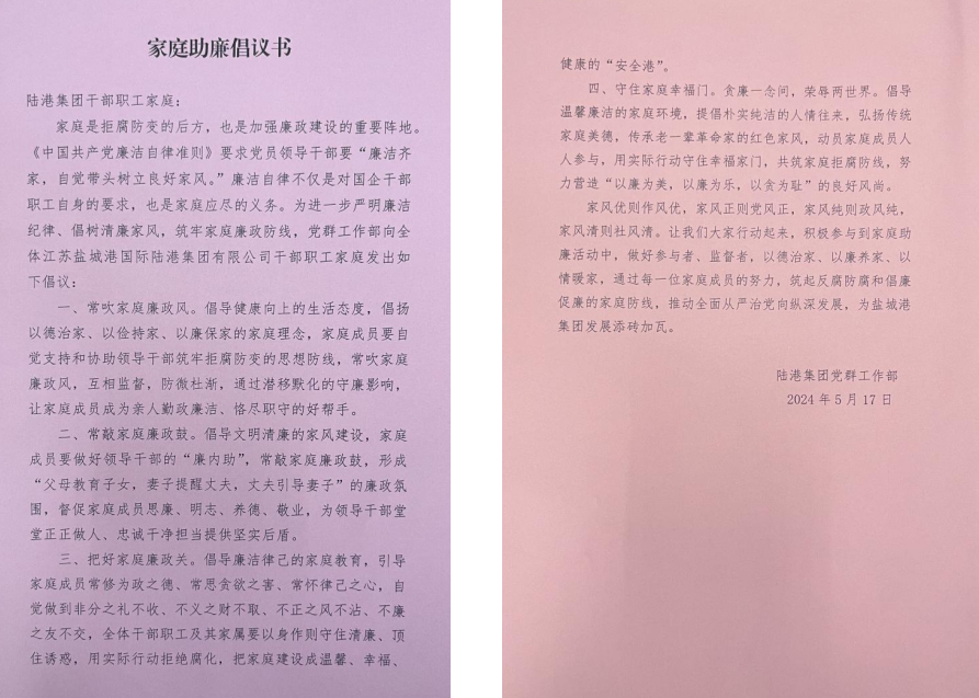 家庭齊心助廉。“為進一步嚴明廉潔紀律、筑牢家庭廉政防線,黨群工作部向全體陸港集團干部職工家庭發(fā)出如下倡議……”在警示教育大會上,陸港集團黨群工作部向全體干部職工發(fā)出了《家庭助廉倡議書》,引導干部職工家屬常吹“家庭廉潔風”,做好“家庭廉內助”,把好“家庭廉潔門”,以清廉家風抵御腐敗歪風,齊心協(xié)力,共同織密“家庭護廉網(wǎng)”。