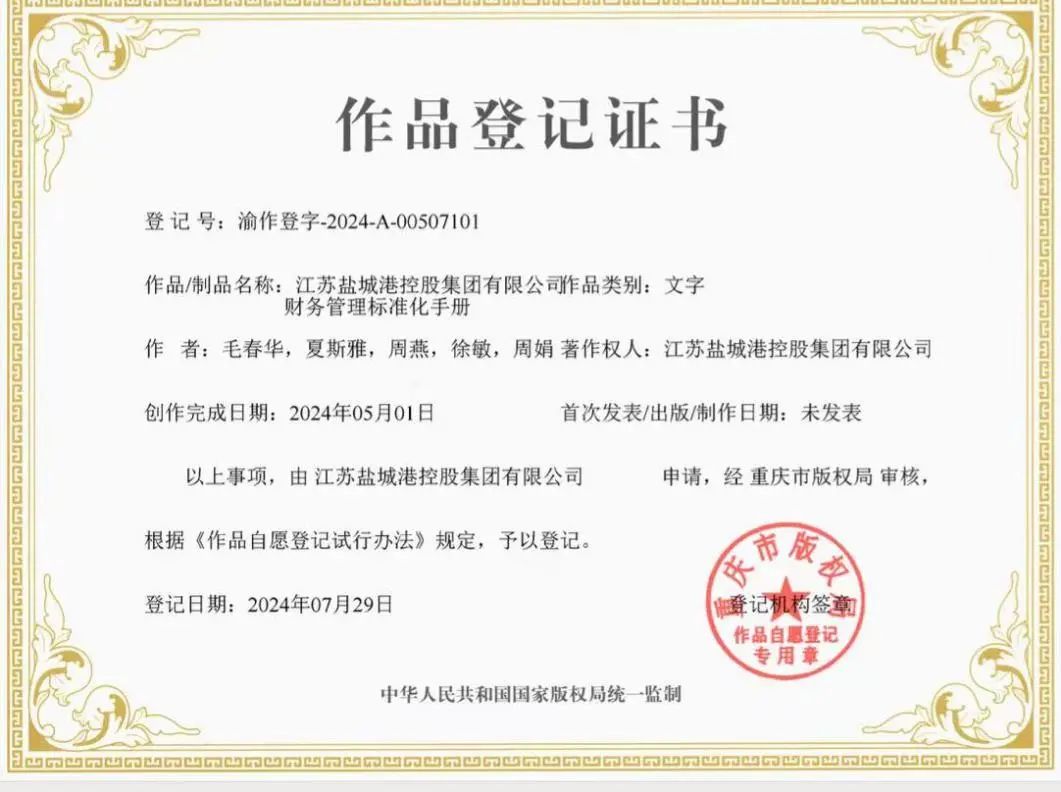 近日,鹽城港集團自主編制的《財務管理標準化手冊》經過嚴格審核與認證,成功取得了由國家版權局頒發的作品登記證書。這不僅是集團在財務精細化管理方面的積極探索,也是集團對財務管理標準化的創新實踐。
