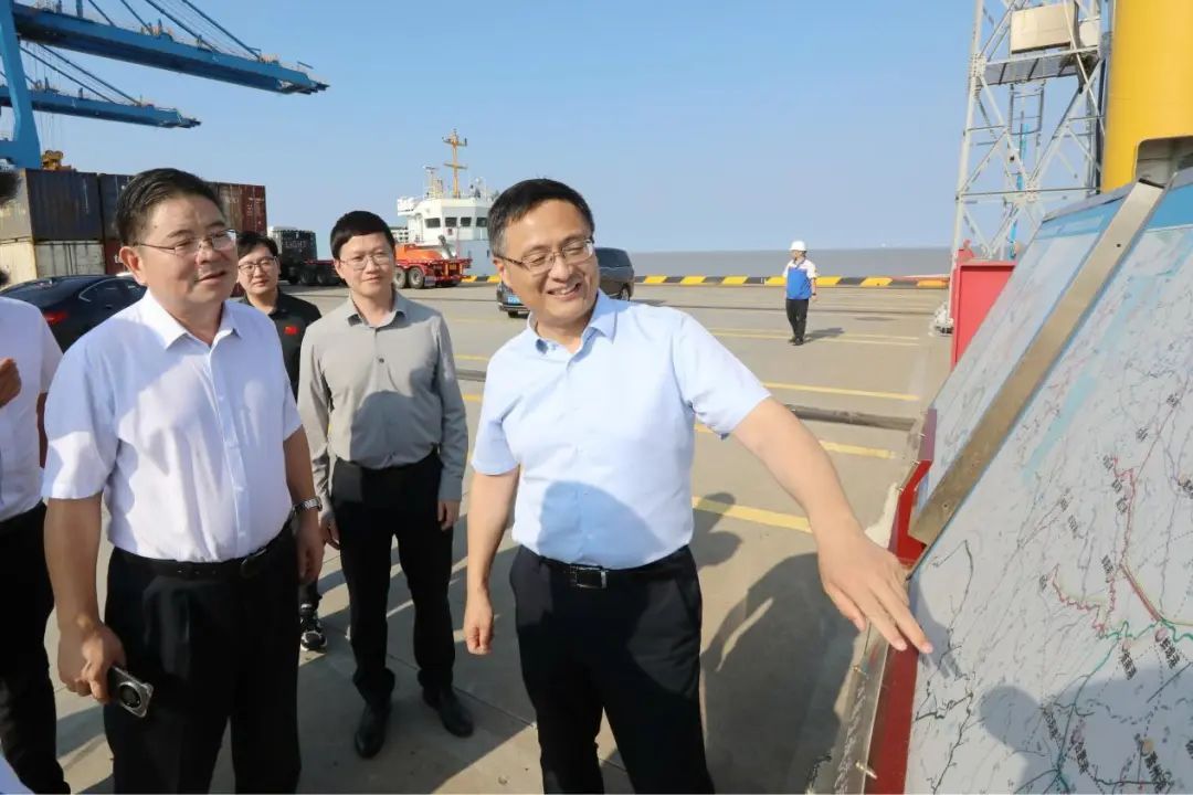 趙守才一行先后來到自動化集裝箱堆場、大豐港區(qū)集裝箱碼頭、通用碼頭等地實地調(diào)研,詳細了解港區(qū)生產(chǎn)經(jīng)營、發(fā)展規(guī)劃及運營管理等情況。
