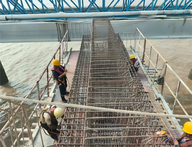 走進糧食碼頭新建泊位及配套設施項目工地,施工人員正頂著烈日進行引橋混凝土澆筑作業?!拔覀儚捻椖块_工就立下了‘進度不滯后、質量不打折’的軍令狀?!表椖控撠熑私榻B,為確保工程按計劃推進,團隊早在開工初期就聯合施工單位、監理部門制定了詳細的施工計劃,將工期細化到每周、每日,通過“倒排工期”的方式壓實責任。針對沿海地區夏季多臺風、暴雨的特點,碼頭建立了一套“預警——響應——切換”的應急管理體系。這種提前備好應急預案、快速切換施工安排的模式,為工程穩步推進筑起了“防護墻”。