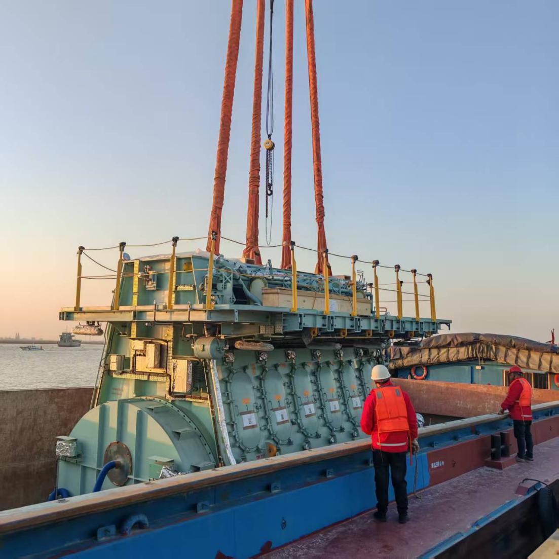 此次集中作業期間,港區陸續完成了兩臺總重349噸的船舶內燃機、一臺405噸發電機、一套280噸發電機組以及兩套總重380噸設備的接卸任務。面對船舶集中到港、貨種復雜多樣的挑戰,響水港區生產團隊提前部署制定個性化的工藝方案,科學調配吊裝資源。針對變壓器等精密設備,專項采取低速平穩平移、多點立體防護、全程實時監測等精細化舉措,全方位保障貨物完好無損、作業安全零事故,以專業實力贏得了新老客戶的高度認可與廣泛贊譽。