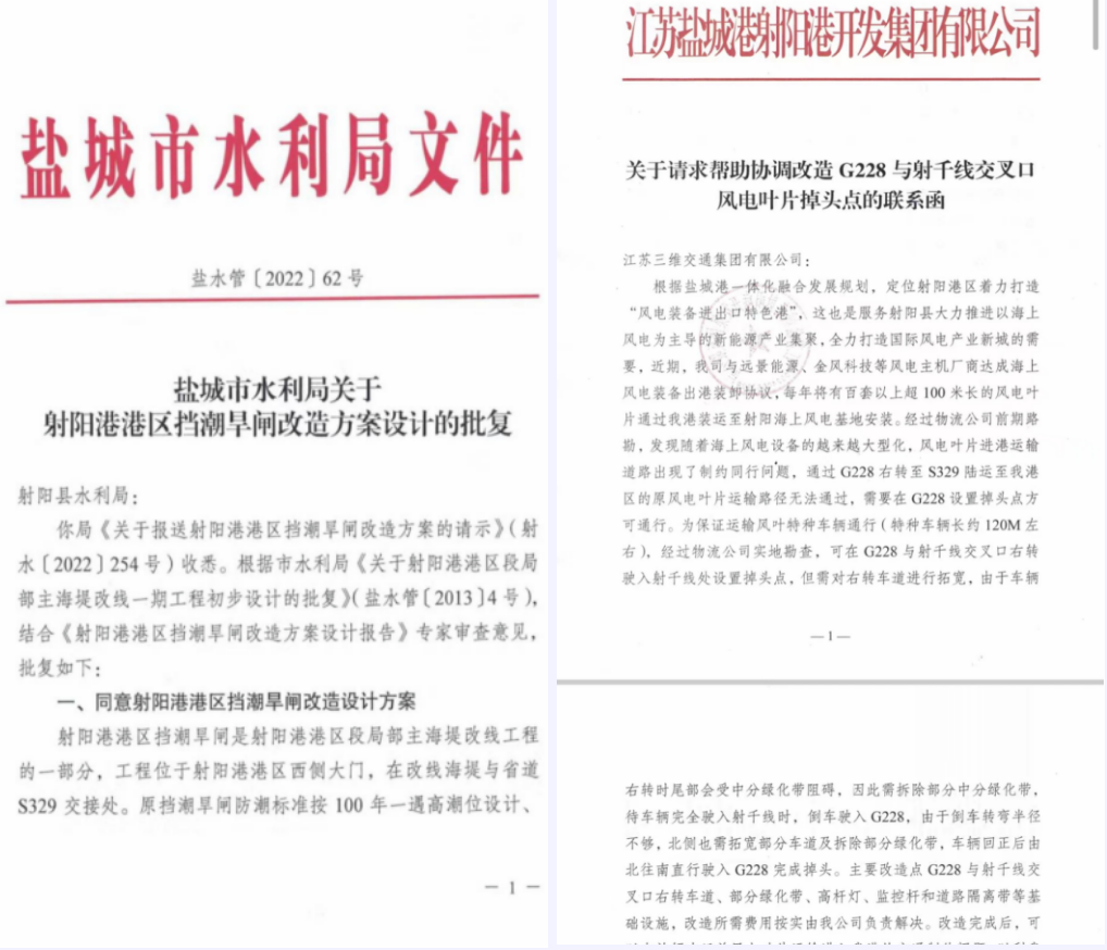 射陽港區在風電業務市場調研拜訪客戶時發現,隨著海上風電設備大型化發展趨勢,120米以上風電葉片運輸在S329和G228的進射陽港交匯處,受道路限高、轉彎半徑小等影響,葉片運輸不能安全通過,存在運輸堵點;同時還發現,射陽龍源海上風電場項目采用的遠景能源8.5MW主機寬度在8米以上,而射陽港區S329進港道路上的擋潮旱閘,位于道路中間位置且建有混凝土中墩,導致通行寬度不足8米,成為又一運輸堵點。