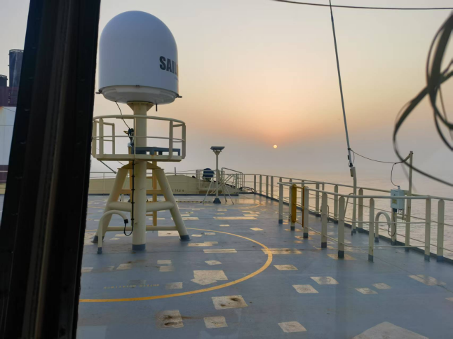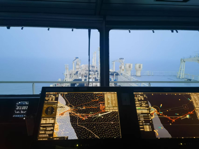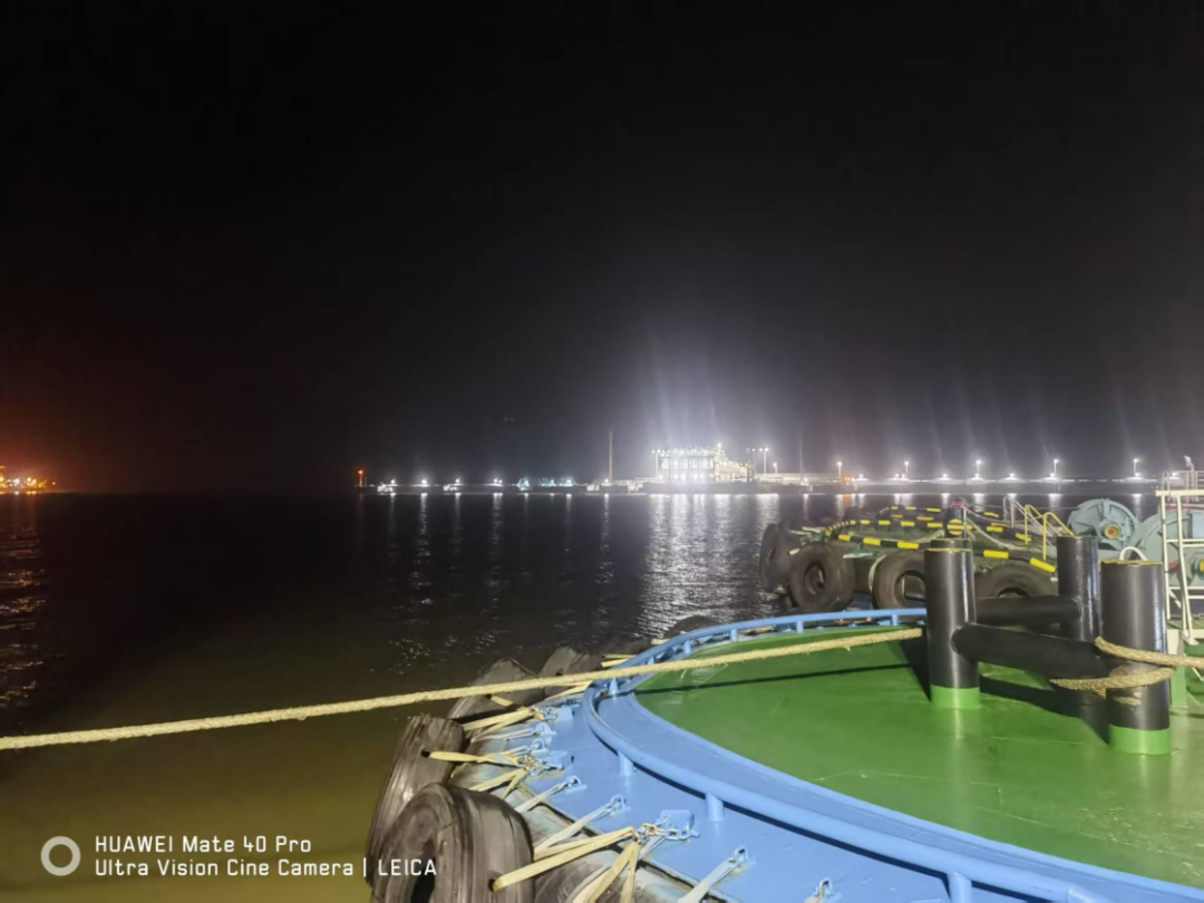 面對“晨昏蒙影”特殊時段(黎明前光線昏暗期),引航員提前1小時登輪,與船長反復核對潮汐、流速和船舶操縱特性。在朝陽初升的關鍵窗口期,引航員通過精準操控,在大馬力拖輪協(xié)同配合下,克服船舶慣性、風流壓差等技術難點完成精準靠泊。