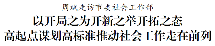 組建黨委社會(huì)工作部,是以習(xí)近平同志為核心的黨中央堅(jiān)持和加強(qiáng)黨的全面領(lǐng)導(dǎo)、推進(jìn)國(guó)家治理體系和治理能力現(xiàn)代化的重大舉措。市委堅(jiān)決貫徹落實(shí)黨中央和省委決策部署,組建成立社會(huì)工作部。走訪中,周斌察看市委社會(huì)工作部辦公環(huán)境,與工作人員深入交流,了解大家崗位職責(zé)以及工作磨合情況,鼓勵(lì)要切實(shí)增強(qiáng)責(zé)任感、使命感、榮譽(yù)感,圍繞機(jī)構(gòu)職能履職盡責(zé),相互配合、促進(jìn)融合、做好聯(lián)動(dòng),在新征程上展現(xiàn)新氣象、體現(xiàn)新?lián)?dāng)、作出新貢獻(xiàn)。