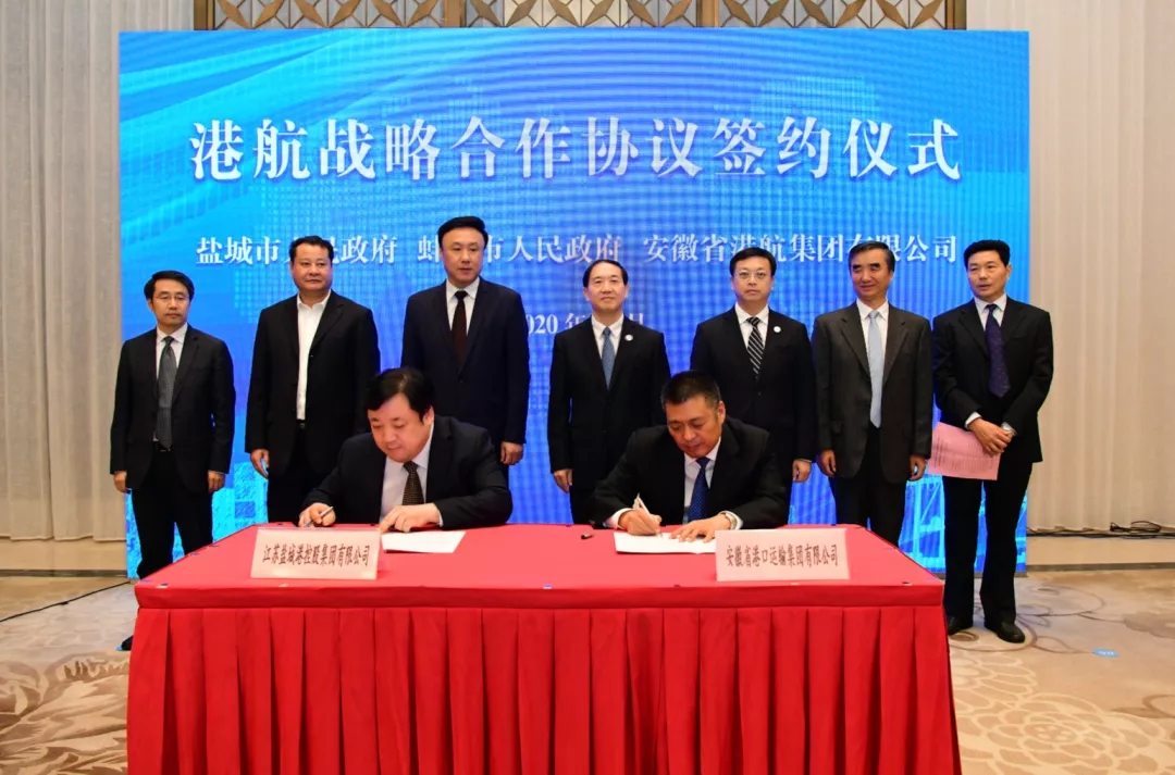 10月28日下午,鹽城市人民政府和安徽省港航集團、江蘇鹽城港控股集團和安徽省港口運營集團在蚌埠市分別簽訂戰略合作協議。蚌埠市委書記汪瑩純、鹽城市人民政府市長曹路寶、安徽省港航集團董事長丁慶領等出席并致辭。