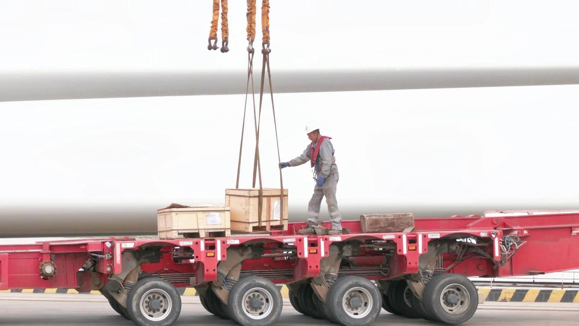 “這批風(fēng)電葉片發(fā)往上海金山,共計36套,單套長度達110米,目前已完成18套的裝載作業(yè),這是第9船次。我們班組正全力協(xié)作,力爭在6小時內(nèi)完成本船次的裝運任務(wù),確保按時離港。”江蘇鹽城港風(fēng)電裝備進出口港有限公司生產(chǎn)組二班班長祁正磊介紹道。